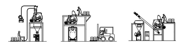 Configuration 3: manual feeding mode connects will connect with no-gravity mixer; after secondary elevation, materials will enter finished product bin and get packed.